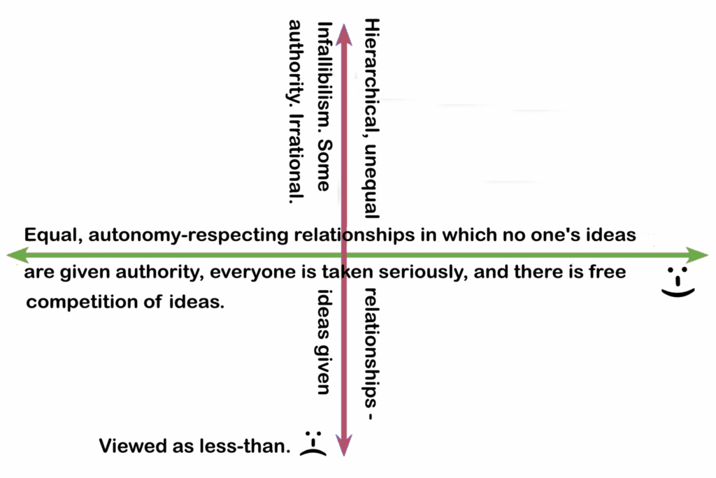 - It is really about taking ideas seriously and not impeding the growth of knowledge. Everyone’s ideas equally on the table—horizontal, equal relationships—versus paternalistic, vertical, top-down, hierarchical, authoritarian relationships in which the parent is deemed to be an authority. Equals in terms of how it is rational to treat ideas. Ideas can either compete equally, freely, all available ideas equally on the table for consideration no matter where the idea came from or who had the idea (rational—nothing interfering with the growth of knowledge), or there can be authority—some sources of ideas being accorded special status as authorities, their ideas being deemed to be authoritative, not open to question, which effectively means that some of the available ideas are not allowed on the table for consideration.